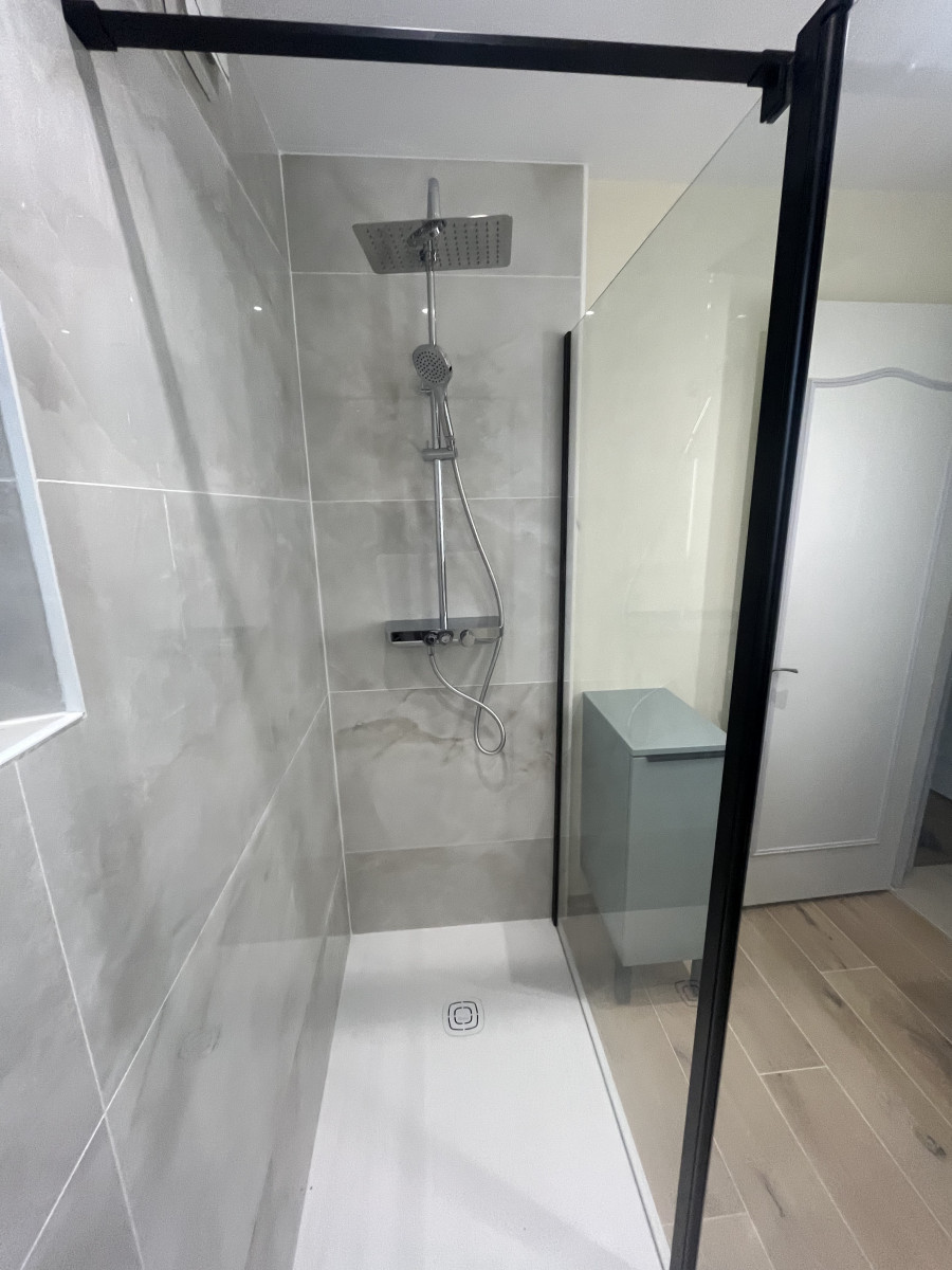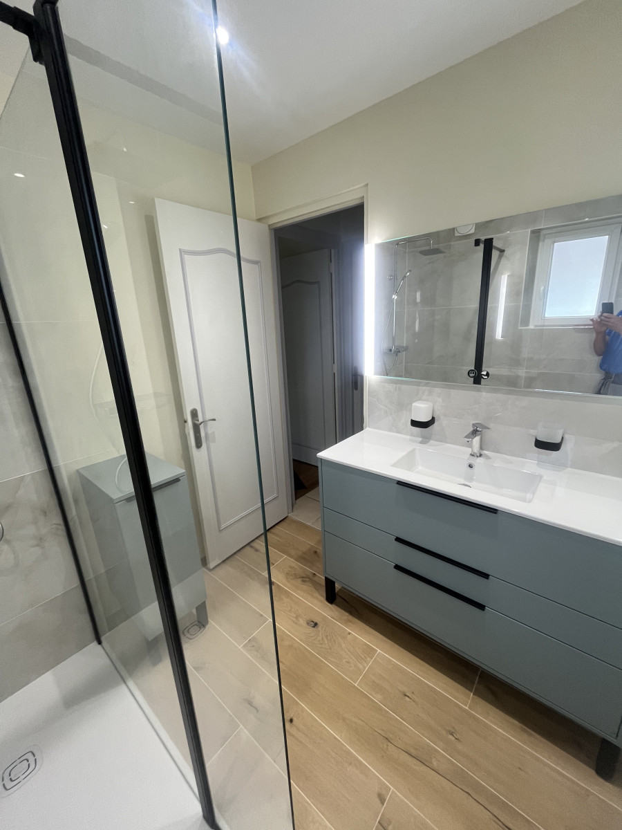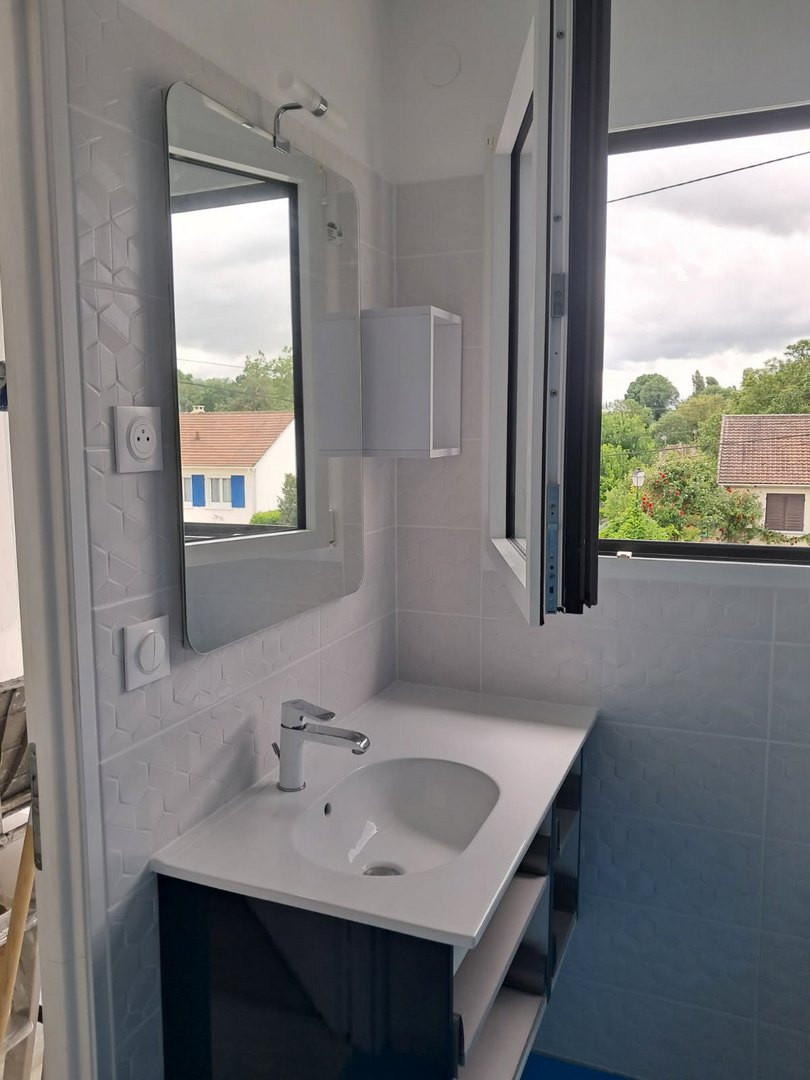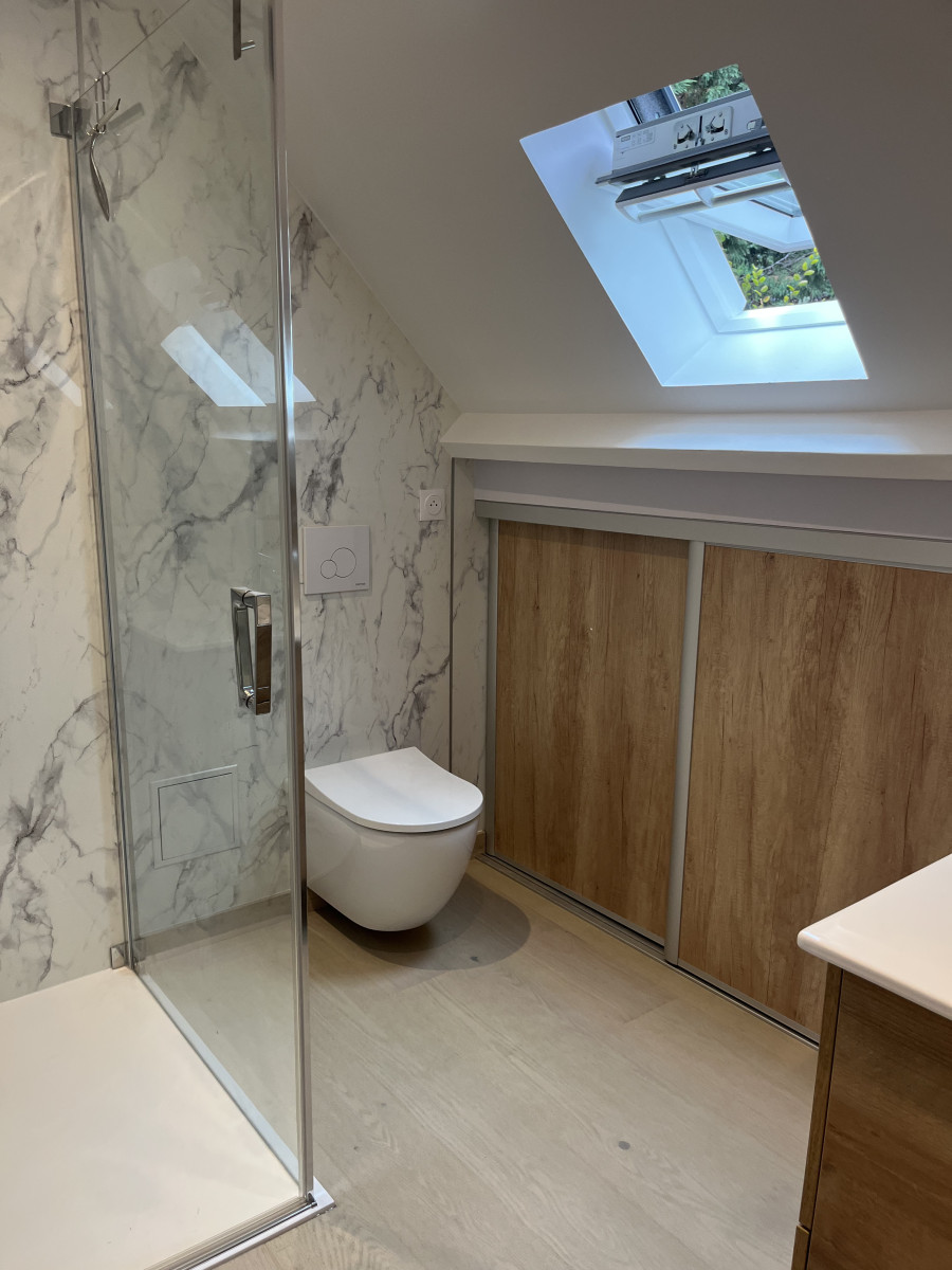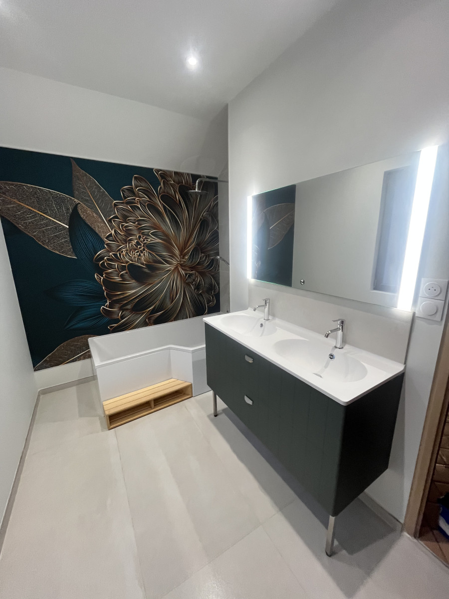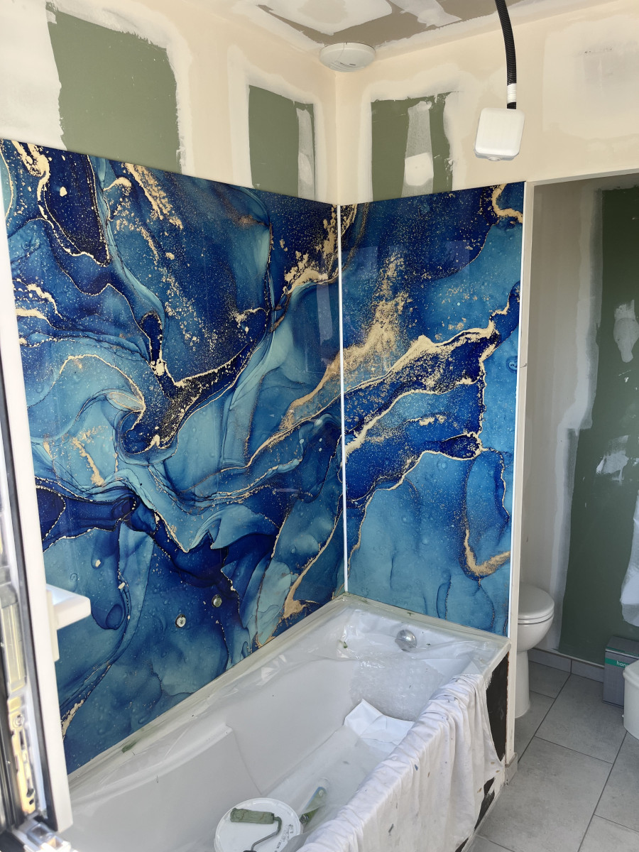 Réalisation d'une salle bain en panneaux Vipanel, faïences et peinture.
